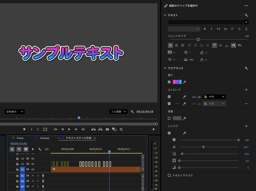 複数のテロップの見た目を変更するには、タイムラインにあるテキストクリップをまとめて選択した後にプロパティパネルのアピアランスから塗りやストロークを調整します。